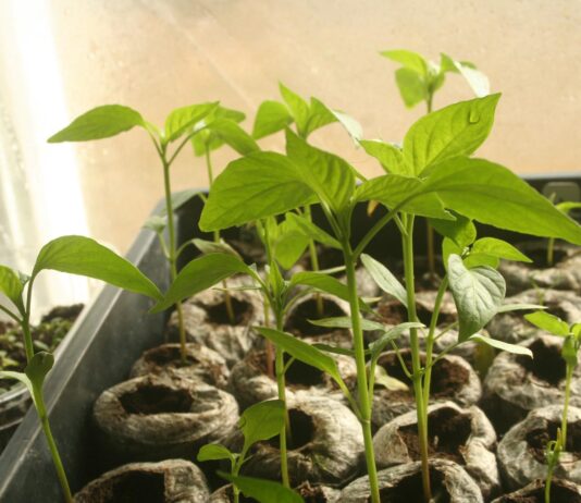 After only a week's time, our peppers are popping up like crazy. They seem to love the damp peat pellets, container covered with a...