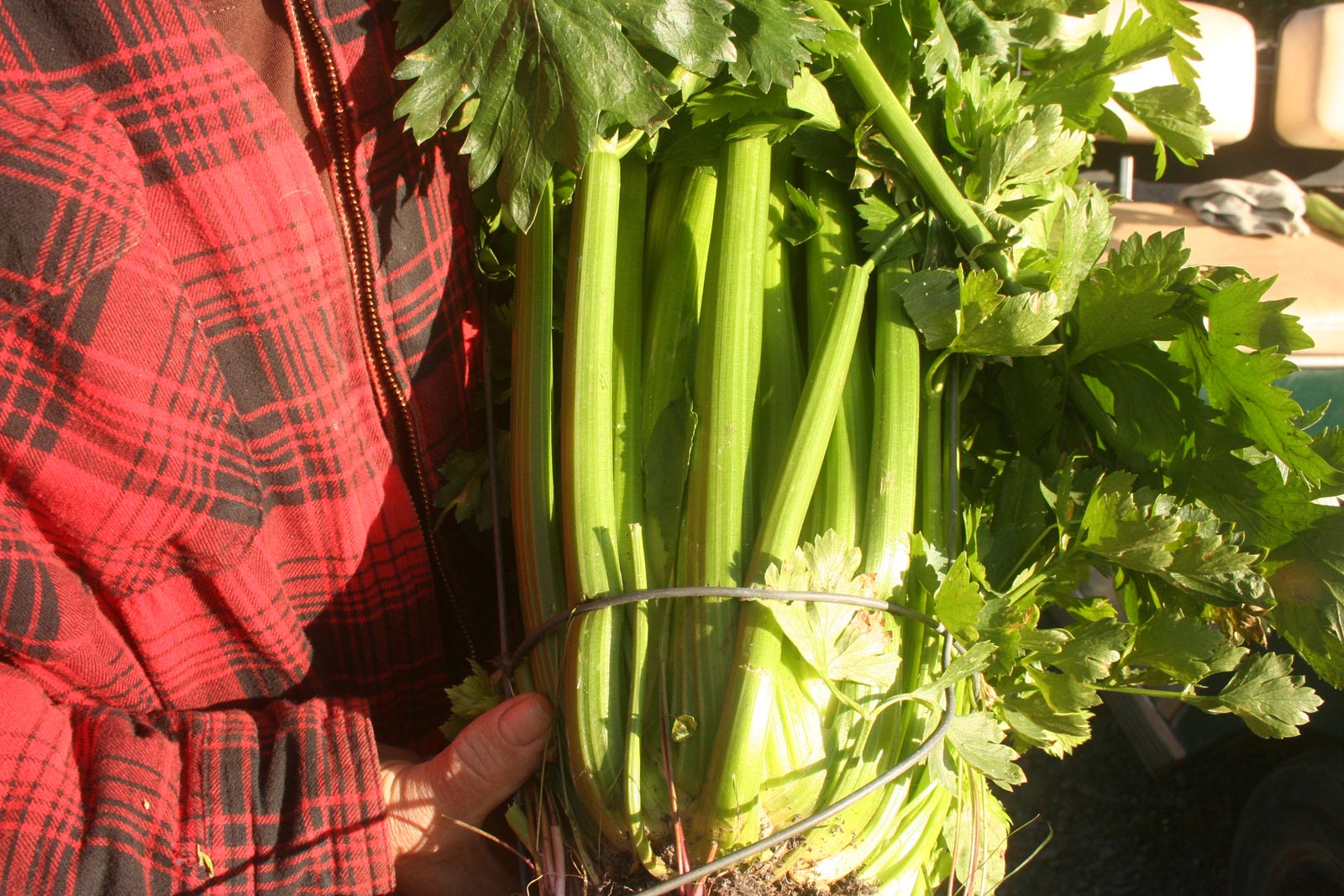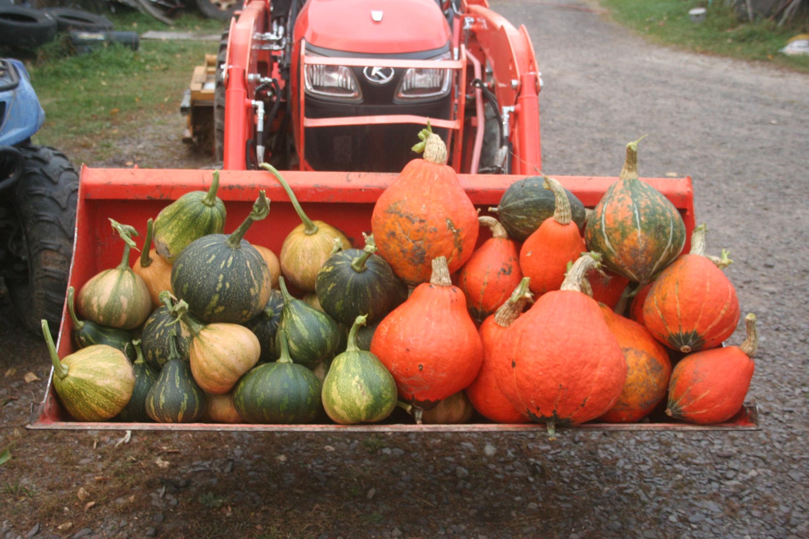 Yesterday, our friend, Sherri, came over and brought us some seeds she’d saved plus the hugest, most wonderful head of Golden Self-Blanching celery I’ve ever seen. (Grown from our seed, of course.) We picked the dry beans that were left, in preparation for the freeze forecast for tonight. Not frost — freeze, with the temperatures in the low twenties F. She and Will went out and picked all the squash left in the gardens then she and I picked the last zucchini, Costata Romanesco, which is our very favorite. I knew we had some nice ones. But, holy cow, we got a whole golf cart load, heaped up!