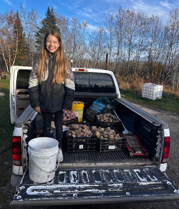 There are still a lot of tomatoes I’m trying madly to get canned up. (I did send one crate of tomatoes home with Bill and the family.) I was sure happy to have such a happy, enthusiastic crew of potato harvesters. Grandkids, Mason and Ava, were right in there, busy as beavers, making us very proud. — Jackie