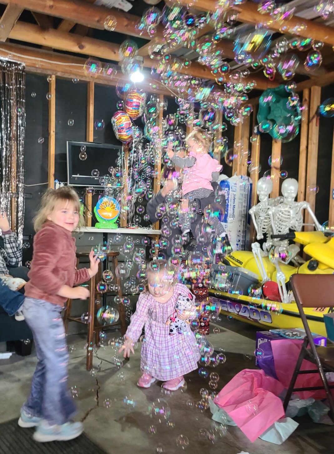 Melanie and sister, Delilah, really enjoyed the day, the gifts and the visitors, including aunts, uncles, nephews, and nieces, plus grandparents. It was so much fun watching her squeal and laugh, opening all her presents. But I think the most fun was when Grandma Karla got down the bubble machine and set it to making bubbles!