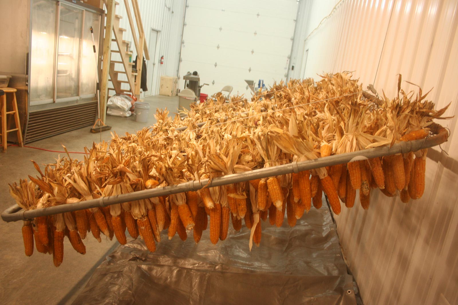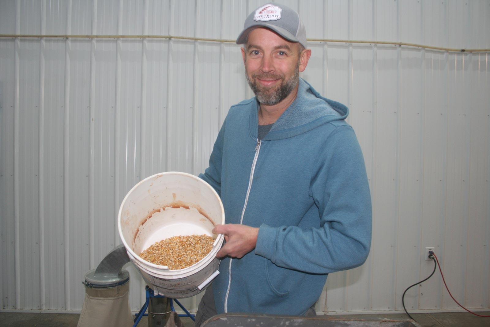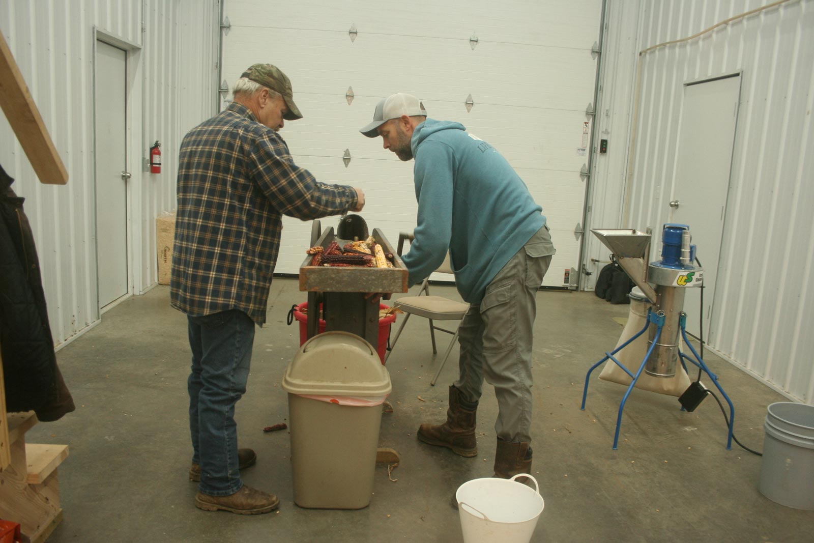 It was fun seeing the equipment Jesse had found to speed up the whole business. I especially loved the antique hand driven corn sheller. We have a corn sheller that you fasten on the side of a barrel but theirs is way faster and pretty darned cool! You just check out the ears of corn for any bad kernels then toss it in the maw of the sheller, turning the side handle. Out pops the empty cob and the shelled corn drops out the bottom into a bucket. Pretty darned slick. Then there was the fanning device which blew chaff off into a bag, leaving clean seed in another bucket. That sure beats the way I do it, pouring one container of seed into another container, winnowing off the chaff in a stiff breeze. It’s faster and you don’t have to go out in bad weather!