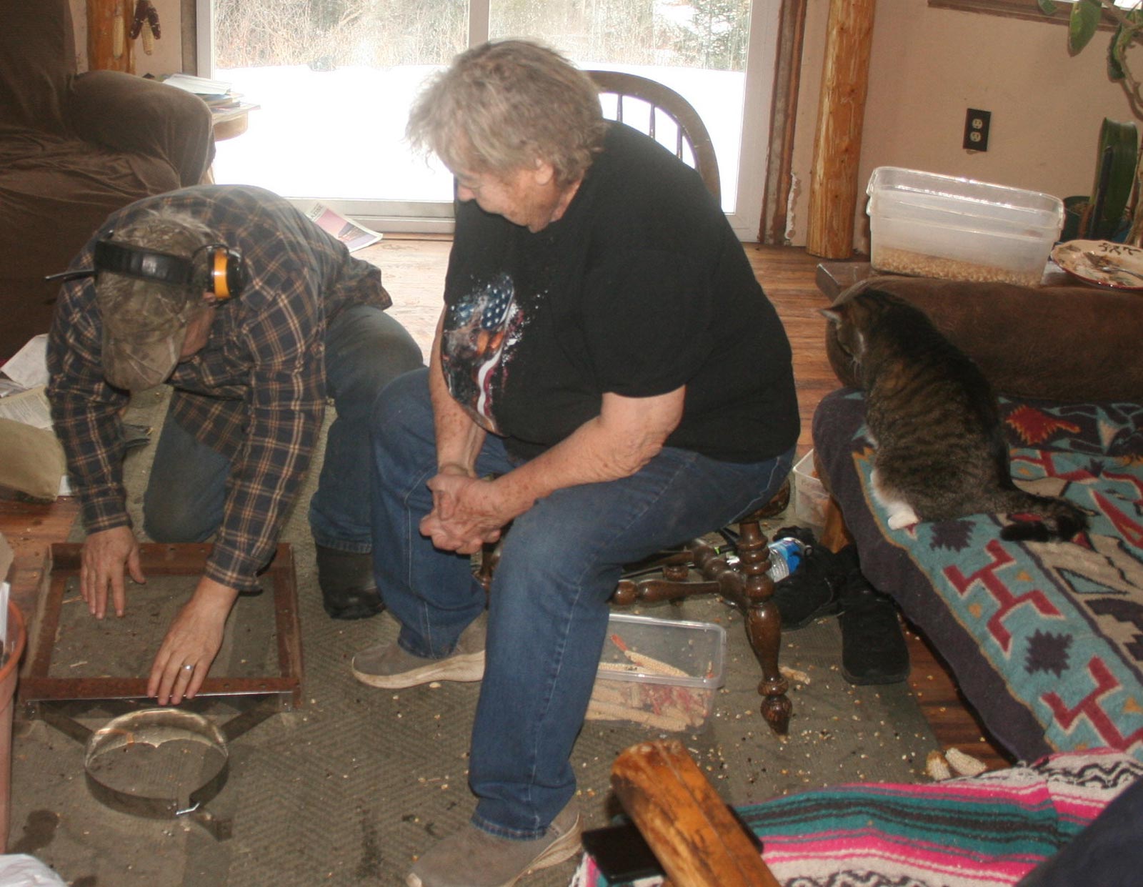 Will and Drew have been working on getting the double wall stovepipe put together on David’s old house. It’s been slow because of having to assemble and weld the support brackets needed to hold the heavy, long length of pipe up and away from the houses outside wall. As we don’t have a heated shop, they’ve been doing all but welding in the living room. It’s a little “cozy” in there, as I have also been shelling lots of corn in there and kernels of corn tend to fly everywhere when I’m shelling with our little hand-held corn sheller. Makes quite a mess, for sure! Oh well, things are getting accomplished, so all is good.