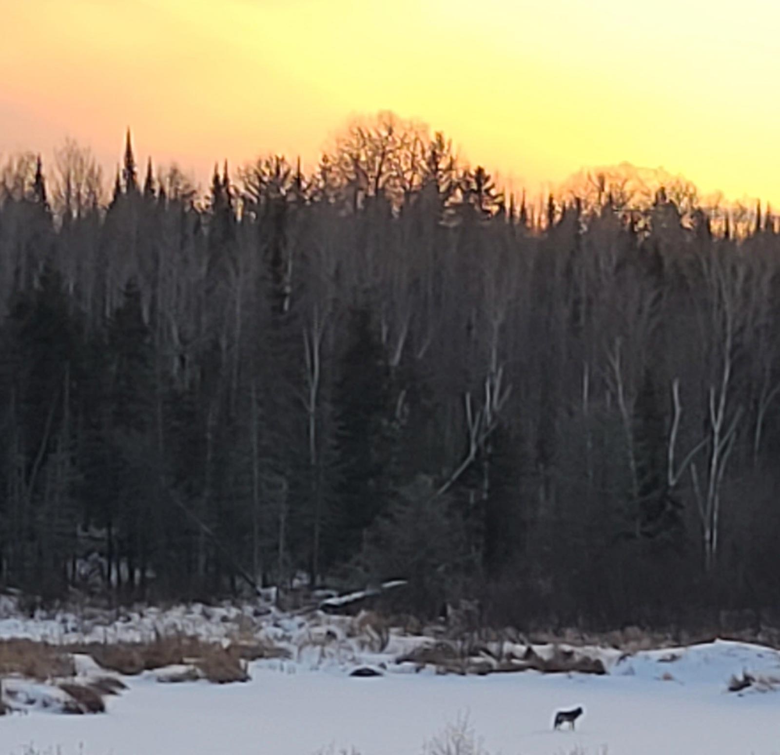 I forgot to tell you, we saw a wolf again, out on our beaver pond. My camera wasn’t handy, so I grabbed my phone and snapped a couple of photos. It’s so cool to watch them, right out our window. He didn’t stick around long though, as he was heading for the woods across the pond at a steady trot.