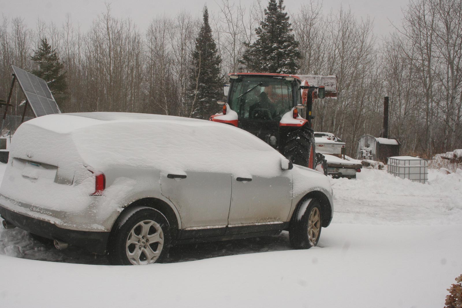 Early in the afternoon, the snow let up so Will and Drew went out to plow the driveway with the plow truck. I’m so glad Will had gotten the plow working, pretty much like normal — up, down, and angled left or straight. (He’s still working on the other angle, but helping Drew takes some time too.) They went out and back, then cleared out over to Drew’s house. Then they jumped on both the little and big Kubotas and neatened up the yards. Drew cleared a nice trail to the goat barn/chicken coop while Grandpa used the big Kubota to clear the parking area in front of the house.