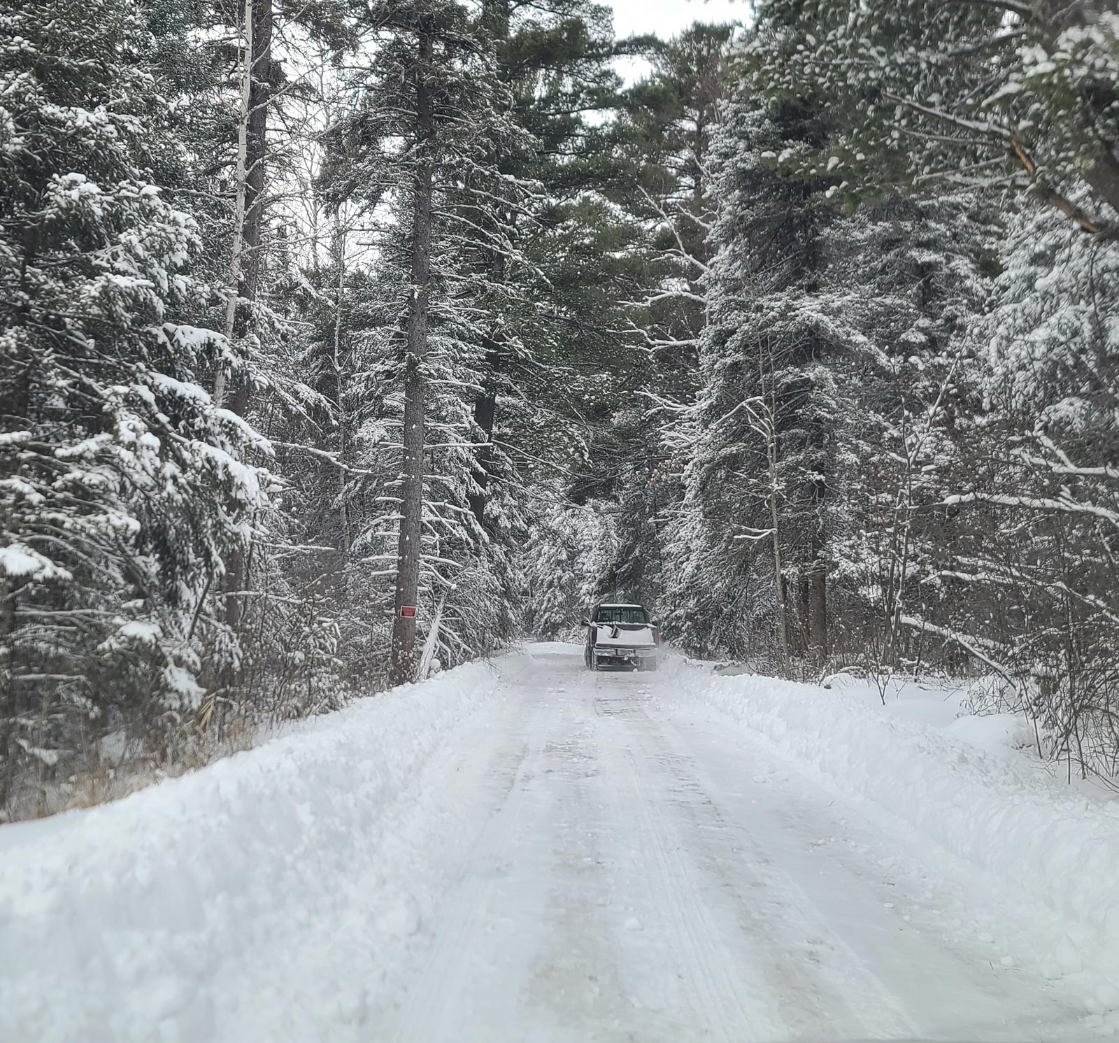 Tossing some kitty litter under the road-side tires and doing a little shoveling on the snowbank side, he was able to gently creep out. And on up the driveway he went, plowing that foot of snow plus the drifts, off into the woods. He had already plowed Drew out so we were all set.