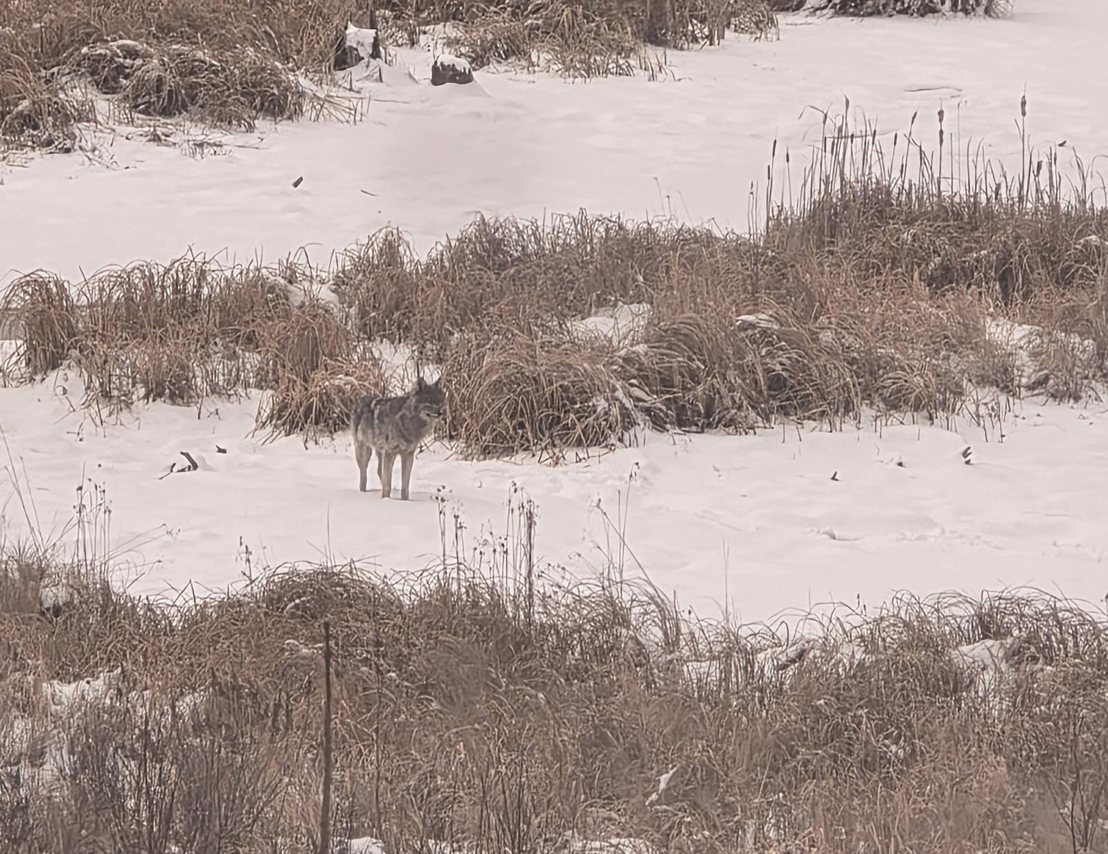 First, Will spotted a deer running across the pond. Shortly after, came a wolf. He wasn’t running but kind of snooping along here and there. He was on the pond long enough for Drew to get some photos with his phone. Phooey, I missed all the excitement, as I was in town buying chicken feed.