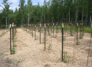 We had a few very nice days (except for the mosquitoes and sand flies!) so Will and I were very busy planting. He set up five stock panel trellises and I followed by planting...