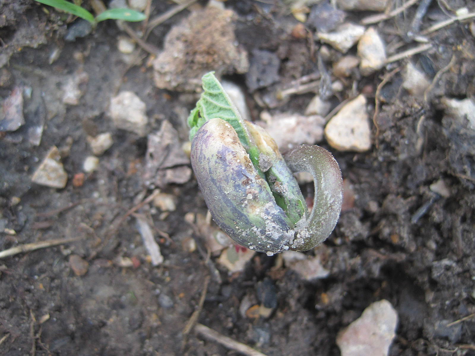 To say these things grew fast was an understatement. I’ve always been impressed by the vigor with which beans emerge from the soil, suddenly erupting with their swollen seed leaves spreading wide and releasing their first true leaves. But these beans — they fairly leapt from the soil, sometimes wearing a retained clump of soil atop their sprouts like a hat. The sprouts were not what I was used to — they were great, purple-streaked things, twice the size of the Turkey Craw sprouts.